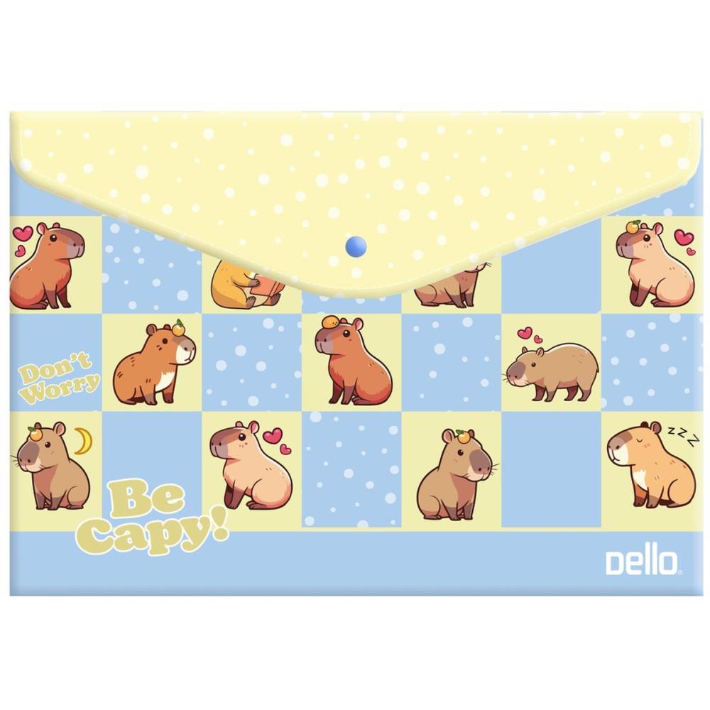 Um charmoso envelope com botao, produzido em polipropileno, com estampa da fofissima capivara.