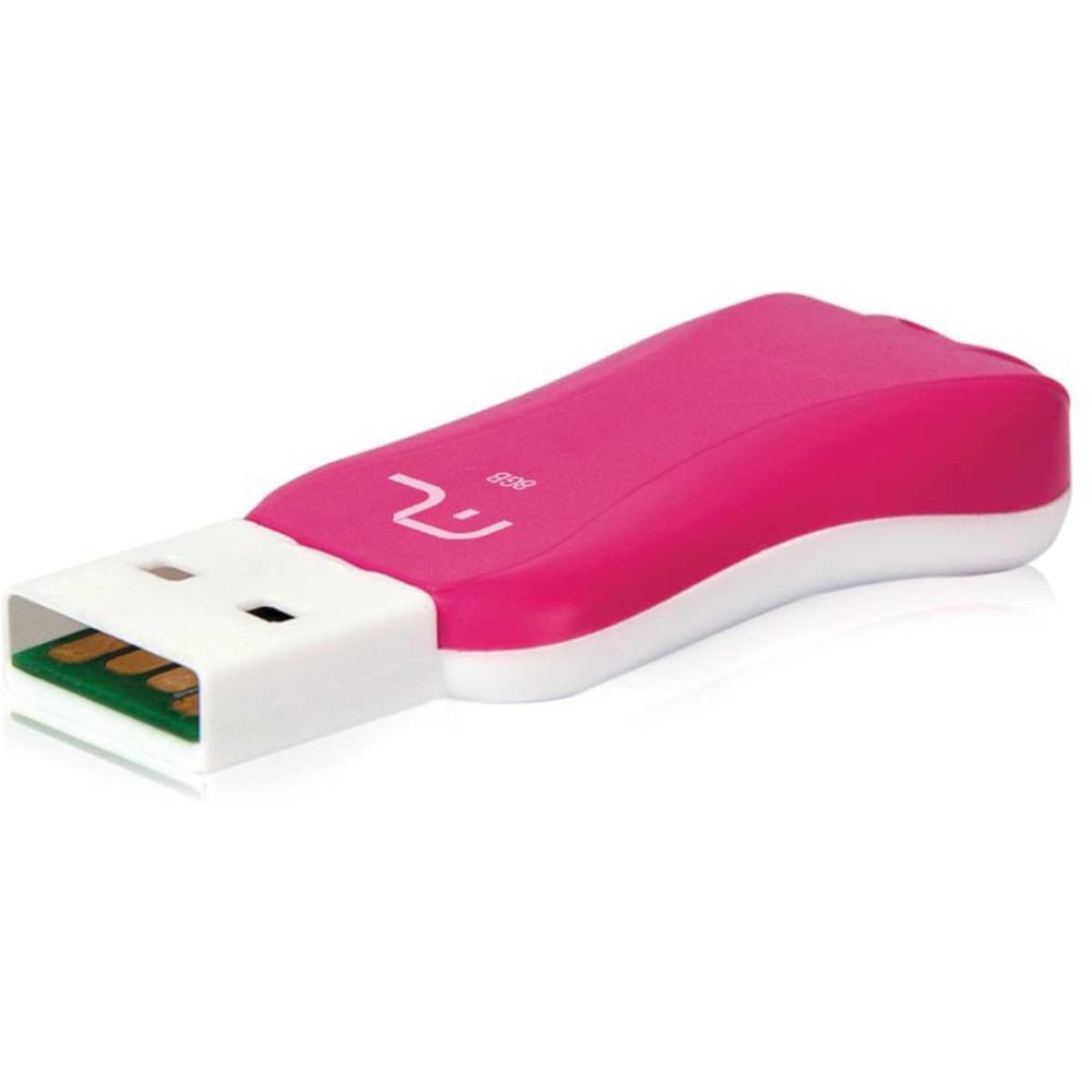 Capacidade: 8 GB . Compatível: Windows 98 e superiores/ Mac OS 9.0 e superiores . Taxas de transmissão de dados: 13 MB/s (leitura) e 5 MB/s (gravação) . Conexão USB 2.0: DC 5 V . Cor: Rosa e branco . Dimensões 16 x 49 x 6 mm . Peso 5g.