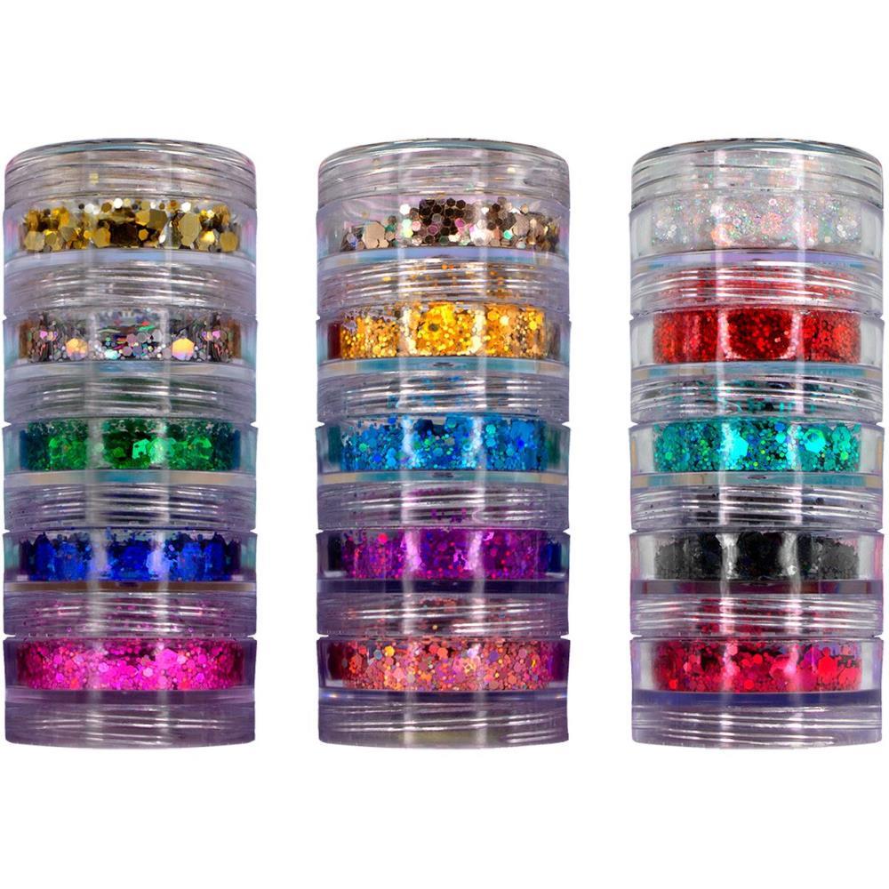 A colecao de glitter Glow Power Colormake proporciona um brilho radiante e poderoso. As particulas em diferentes tamanhos e com efeito holografico, causam uma explosao de cores intensas. E o produto perfeito para voce brilhar em todas as ocasioes! Use no rosto, corpo, cabelo e unhas. Sao 3 kits incriveis contendo 5 cores diferentes em cada um. Glow Power, o poder do brilho ao seu alcance!