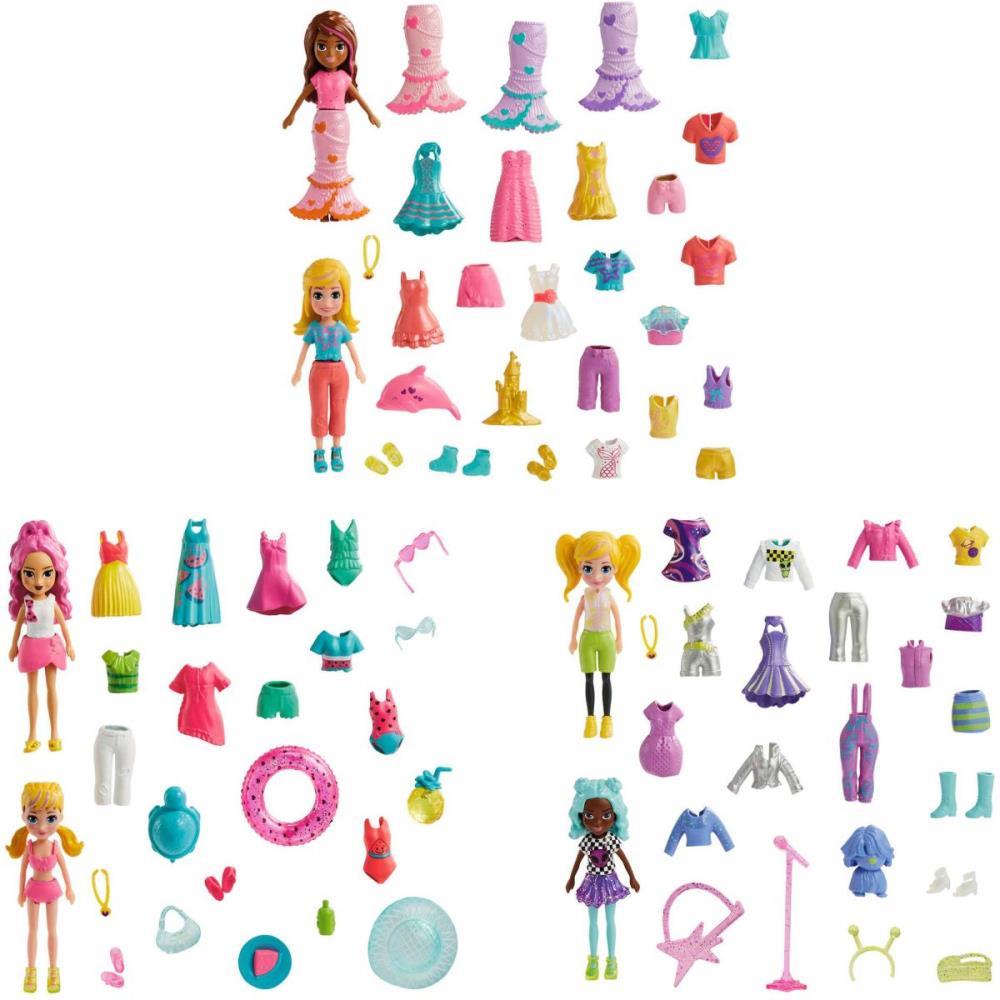 Cada pacote incluí duas bonecas de 7,5cm, 25 roupas e acessórios para misturar e combinar com temas populares: festa na piscina, sereias e mais.