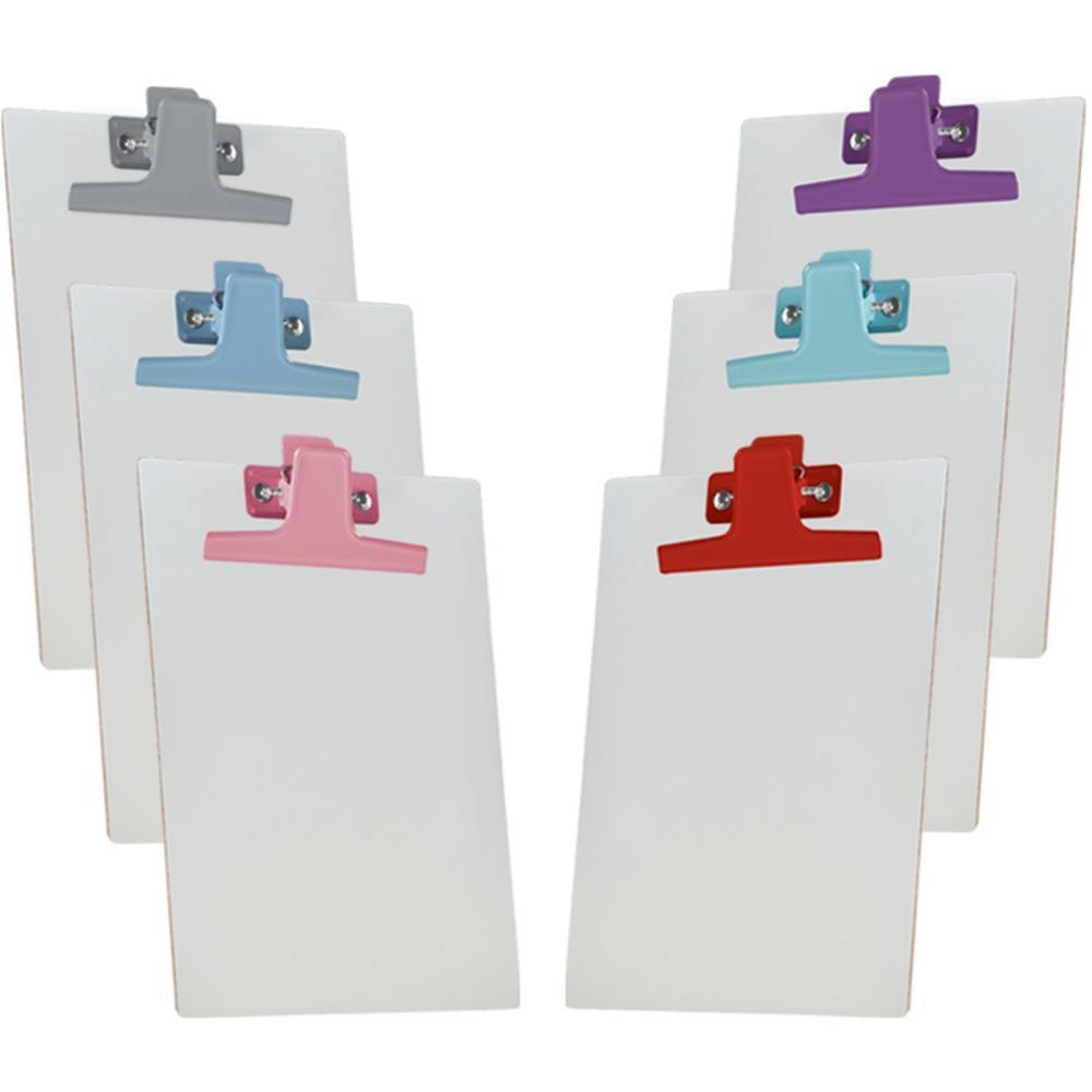 Prancheta em MDF tamanho A5/Meio Ofício com superfície branca, possui um ótimo acabamento dos dois lados, com os cantos arredondados e prendedor metálico em seis cores (caixa com 6 pranchetas com os prendedores em cores sortidas).