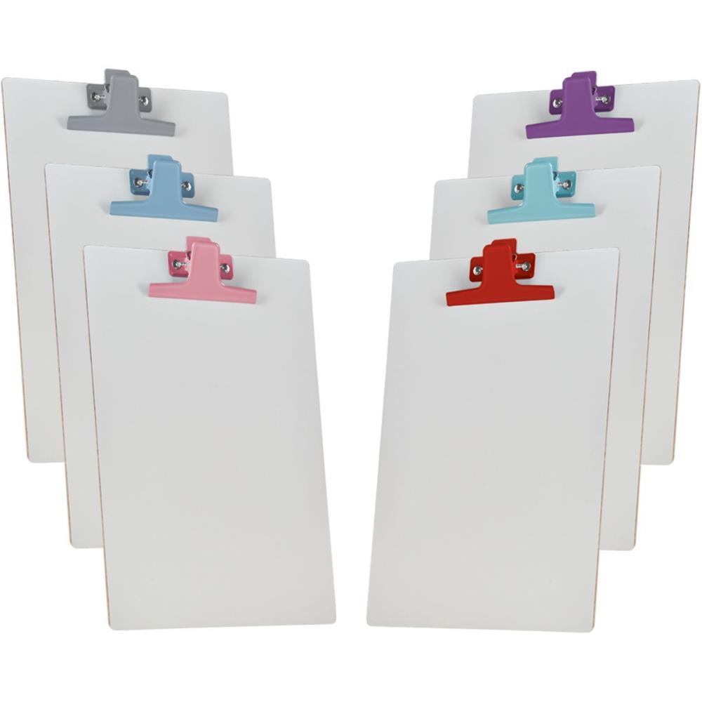 Prancheta em MDF tamanho A4/Ofício com superfície branca, possui um ótimo acabamento dos dois lados, com os cantos arredondados e prendedor metálico em seis cores (caixa com 6 pranchetas com o prendedor em cores sortidas).