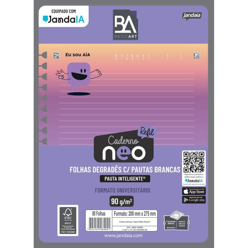 O Refil para Caderno Basic Art Neo Degrade de 80 folhas da Jandaia e uma solucao pratica para adicionar mais paginas a cadernos com encadernacao espiral, com um toque especial de design - O Refil para Caderno Basic Art Neo Degrade de 80 folhas da Jandaia e uma excelente escolha para quem deseja atualizar ou expandir seu caderno com um design moderno e atraente. A combinacao de paginas com efeito degrade e a funcionalidade pratica do refil atende a necessidades tanto esteticas quanto praticas.