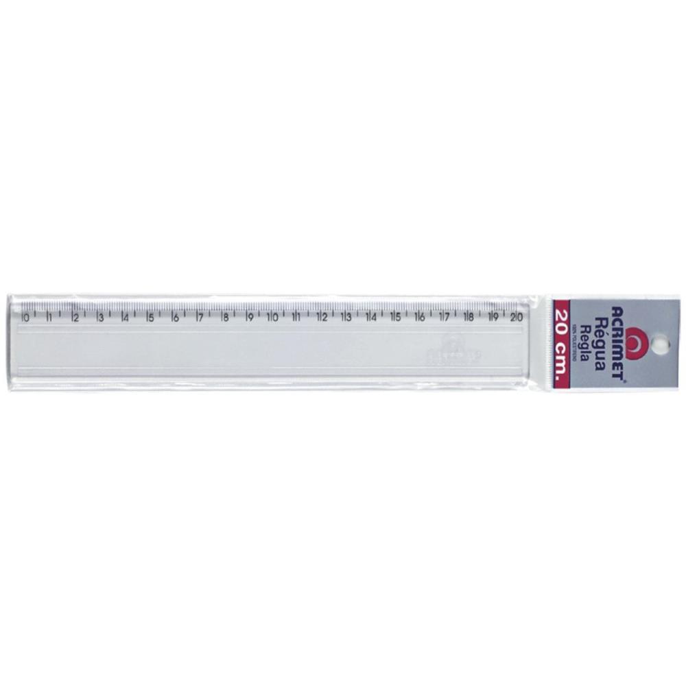 Regua em poliestireno, com escala de 20 cm gravada por transferencia de imagem, garantindo alta precisao. Possui dois micros ressaltos na face que entra em contato com o papel para evitar o desgaste da escala. Cantos arredondados para maior seguranca.