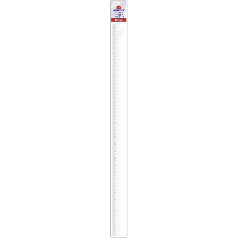 Regua em poliestireno, com escala de 60 cm gravada por transferencia de imagem, garantindo alta precisao. Possui dois micros ressaltos na face que entra em contato com o papel para evitar o desgaste da escala. Cantos arredondados para maior seguranca.