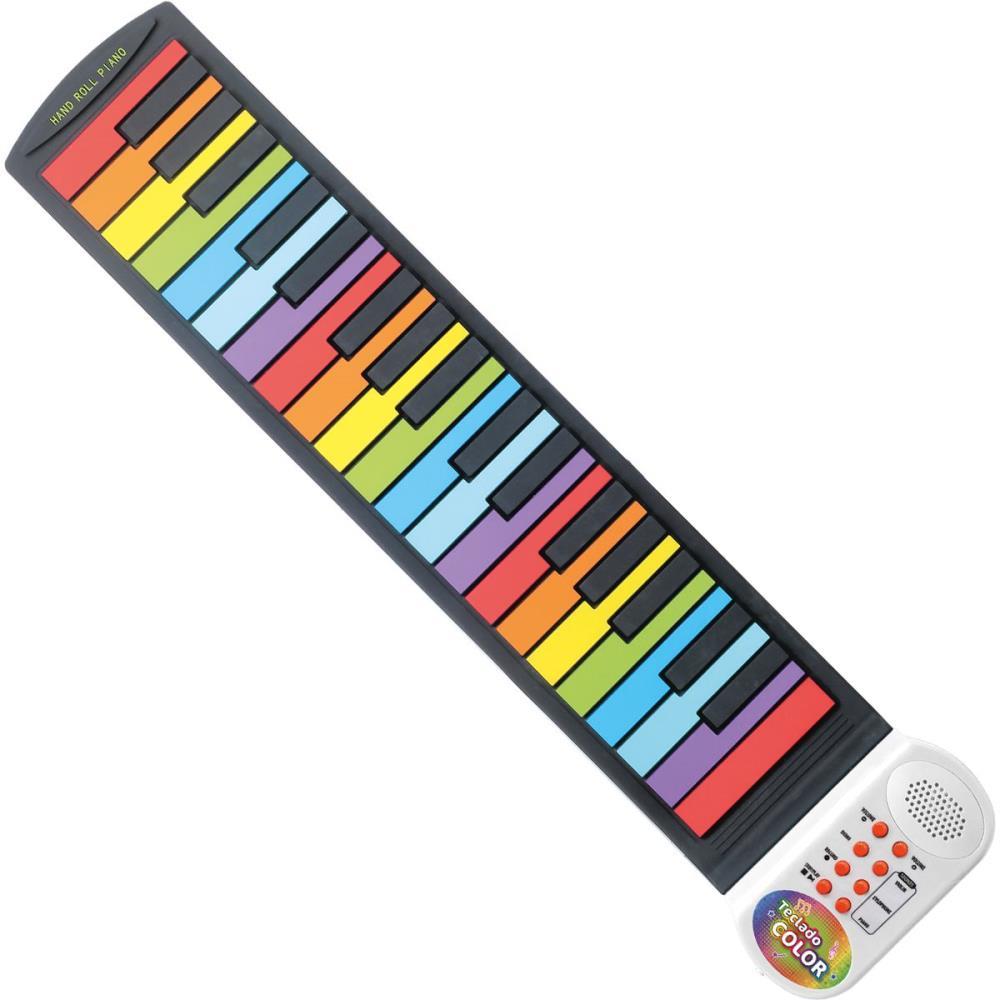 Este teclado e projetado para ser flexivel e portatil, permitindo ser transportado para qualquer lugar pois pode ser dobrado e enrolado, tornando-o facil de armazenar. Com suas teclas coloridas, o Teclado Color Flexivel e perfeito para qualquer pessoas que ame musica. Ele emite som de piano, xilofone e violino! Voce vai adorar a experiencia de tocar diferentes instrumentos com apenas um brinquedo, alem de ajudar a desenvolver suas habilidades musicais, criatividade e coordenacao motora.