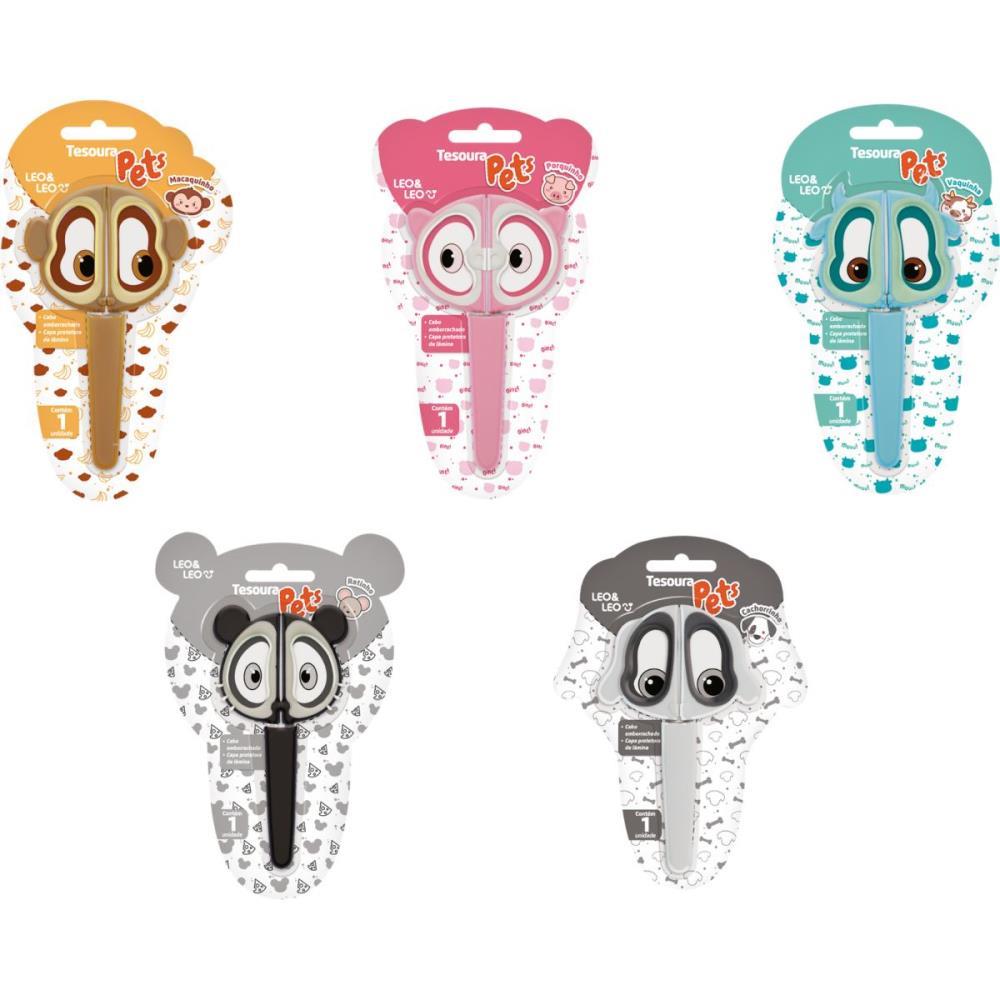 A Tesoura Pets possui cabo emborrachado, capa protetora, ponta redonda e lâmina em aço inox. Além desse, a coleção conta com mais outros 4 bichinhos, macaquinho, porquinho, ratinho e vaquinha.