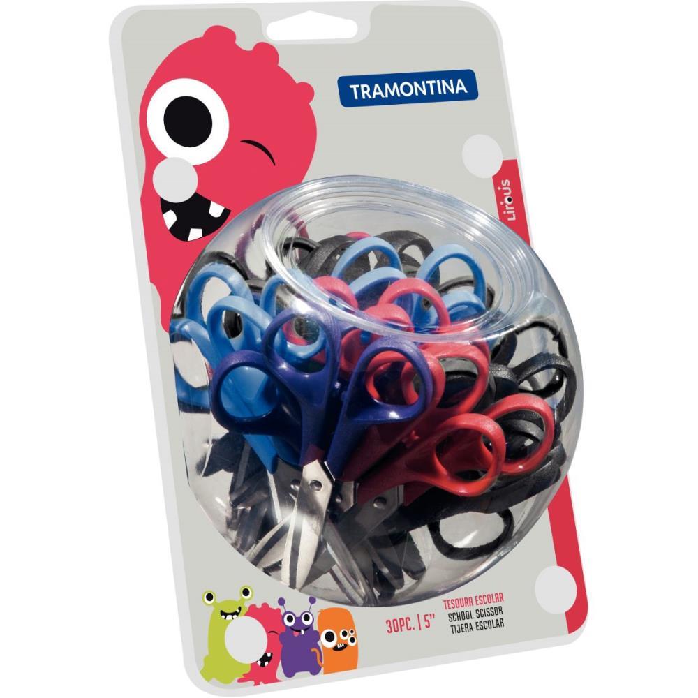 A tesoura escolar Tramontina Supercort Monster com lamina em aco inox com cabo de polipropileno preto display com 30 unidades e o produto ideal para escolas e uso domestico. Com lamina em aco inox, ela garante um corte preciso e duravel, devido ao tratamento termico que mantem a qualidade do fio por muito mais tempo. Seu cabo de polipropileno e resistente e duravel, garantindo uma pegada firme e segura durante o uso. Alem disso, sua cor preta da um toque moderno e sofisticado a tesoura, que permanece bonita por muito mais tempo. E para voce que busca praticidade, ela vem em um display com 30 unidades, pronto para atender a demandas maiores, como em escolas!