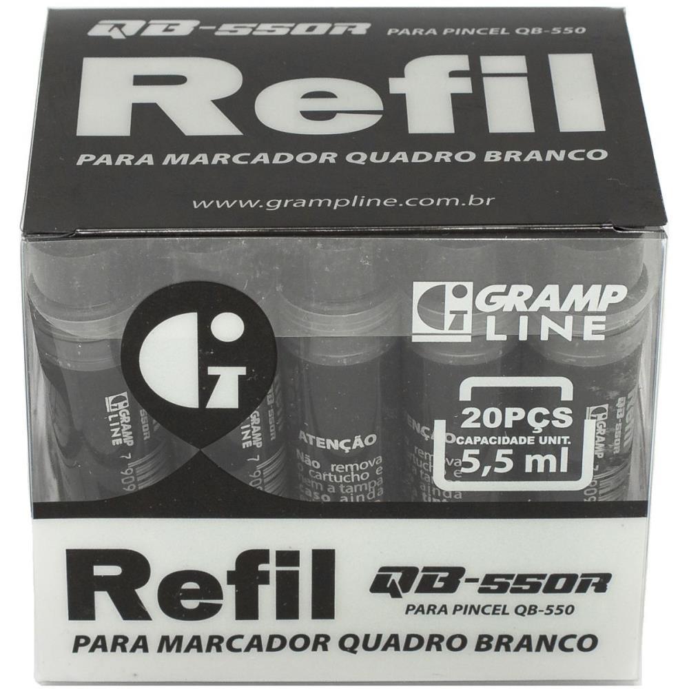 O Refil de Pincel Marcador para Quadro Branco QB-550R da Gramp Line possui tinta de excelente qualidade, nas cores Azul, Preto ou Vermelho, de base alcool, baixo odor, facil remocao e atoxico. Sistema de recarga simples, sem desperdicio. Para recarregar seu Pincel Marcador para Quadro Branco QB-550, de uso diario, comercial, escolar ou domestico.